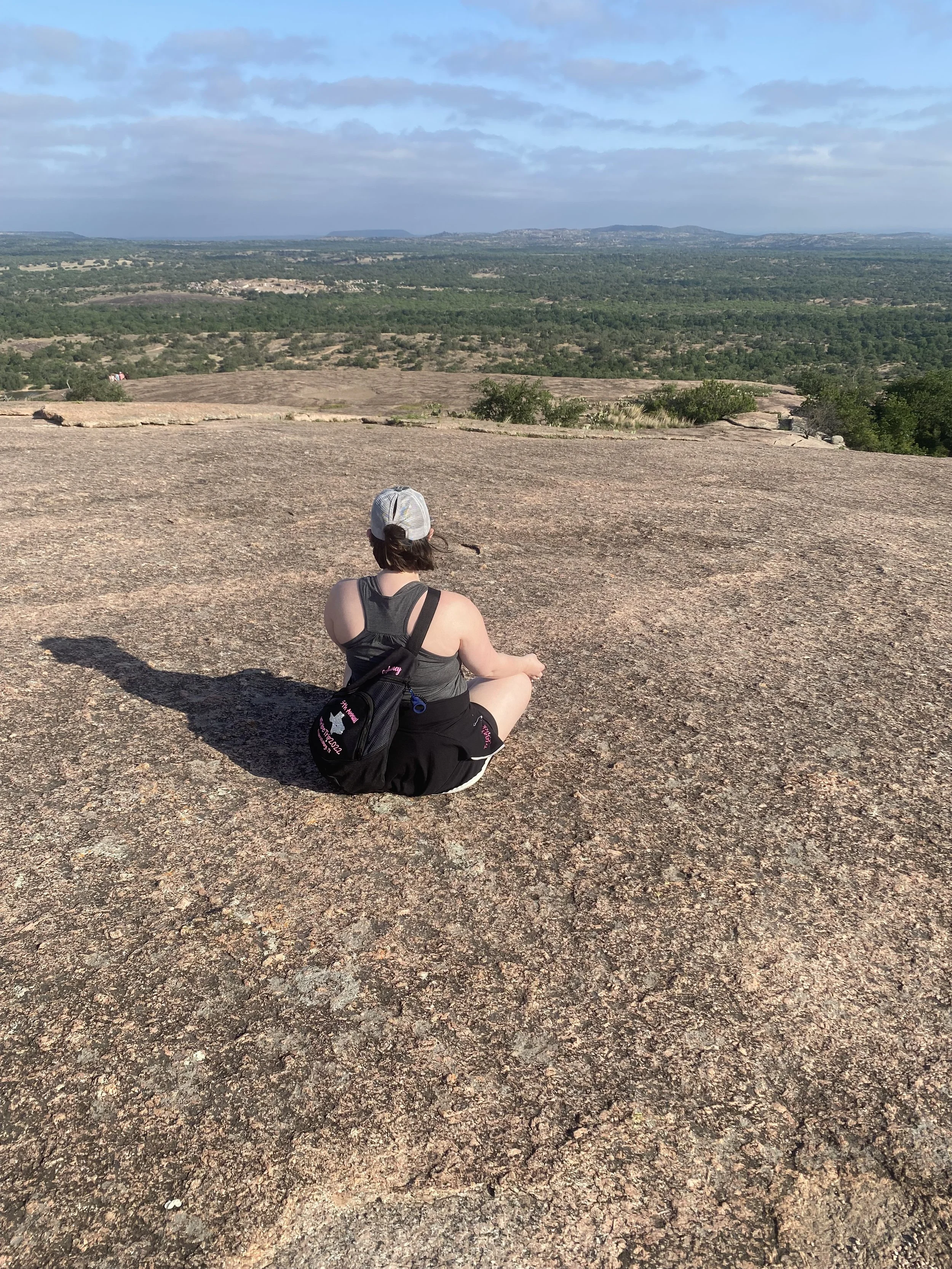 Aubrey Richardson LPC sitting and meditating over Enchanted Rock in Austin, Texas. This photo represents the articles intent of demystifying terminology in meditation.
